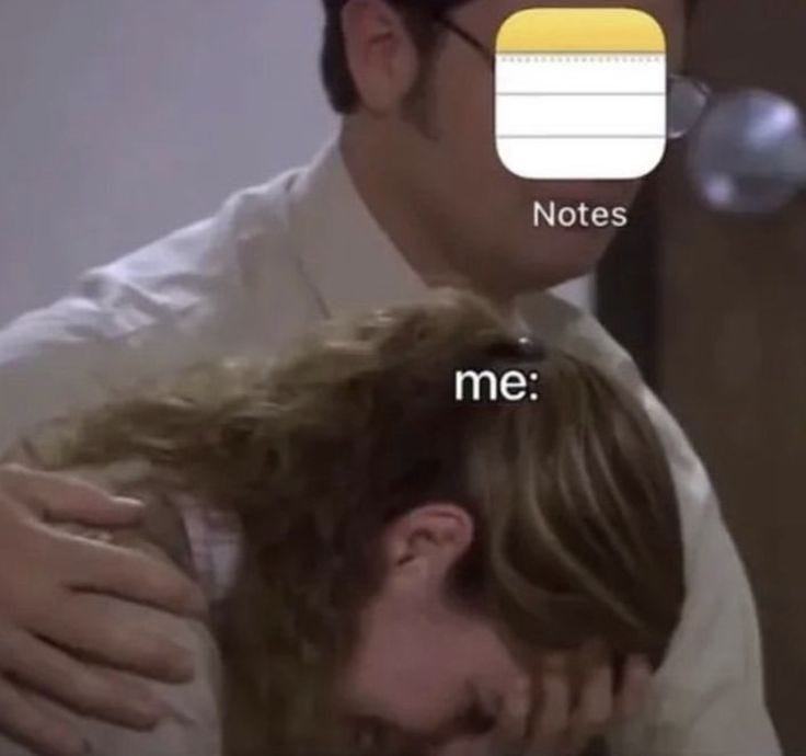 open your notes app and write yourself something completely honest and maybe a little bit extra, the kind of thing you wouldn’t usually say out loud, like a mini burn book entry just for you, something you might roll your eyes at and then secretly feel better reading back, because it’s no longer bouncing around your head asking for attention. get it all out, the frustration, the annoyance, the “why is this happening all at once… i want to burn it all down,” slightly unhinged thoughts that keep circling. no editing, no softening, no trying to make it sound wise or put together. it doesn’t fix anything, but it helps release the pressure and clear a bit of space, like opening a window in a room that’s been holding too much for too long.